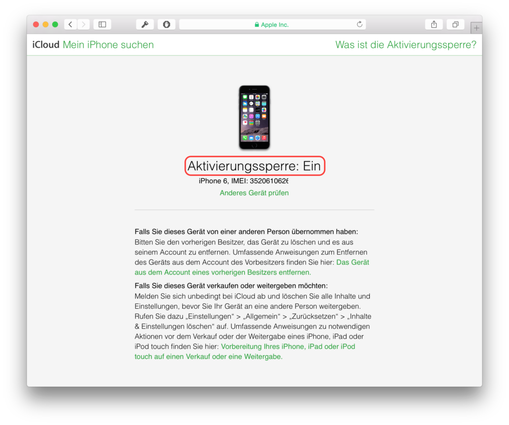 Anschließend erfährst Du sofort, ob eine Aktivierungssperre aktiv ist: