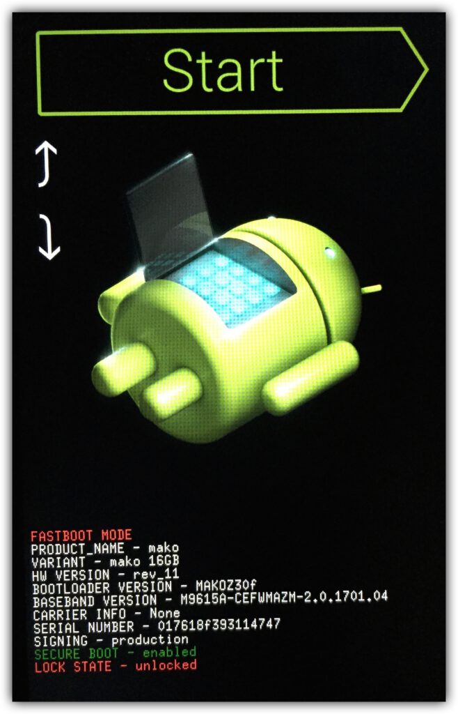Nun musst Du Dein Nexus per Fastboot starten. Schalte es aus und drücke danach gleichzeitig den Power- und den Leise-Knopf, bis folgendes Bild erscheint: