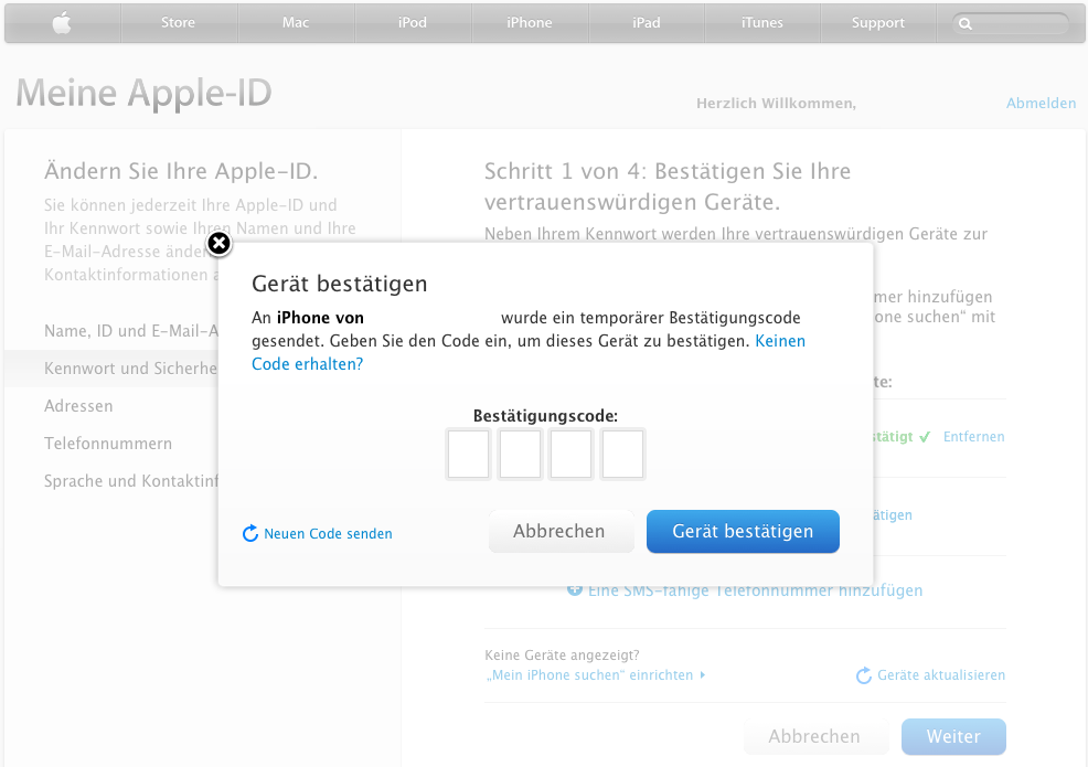 Wenn Sie sich das nächste mal auf der Seite Meine Apple-ID anmelden, werden Sie nach Ihrem Sicherheitscode gefragt und an welches „vertrauenswürdige Gerät“ dieser geschickt werden soll: