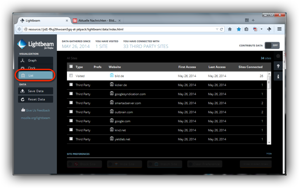 Für Mozilla Firefox gibt es eine interessante neue Erweiterung: Lightbeam for Firefox. Mit Lightbeam siehst auf einen Blick, welche weiteren Internetseiten bei dem Besuch einer Seite informiert werden und Deinen Besuch verfolgen.