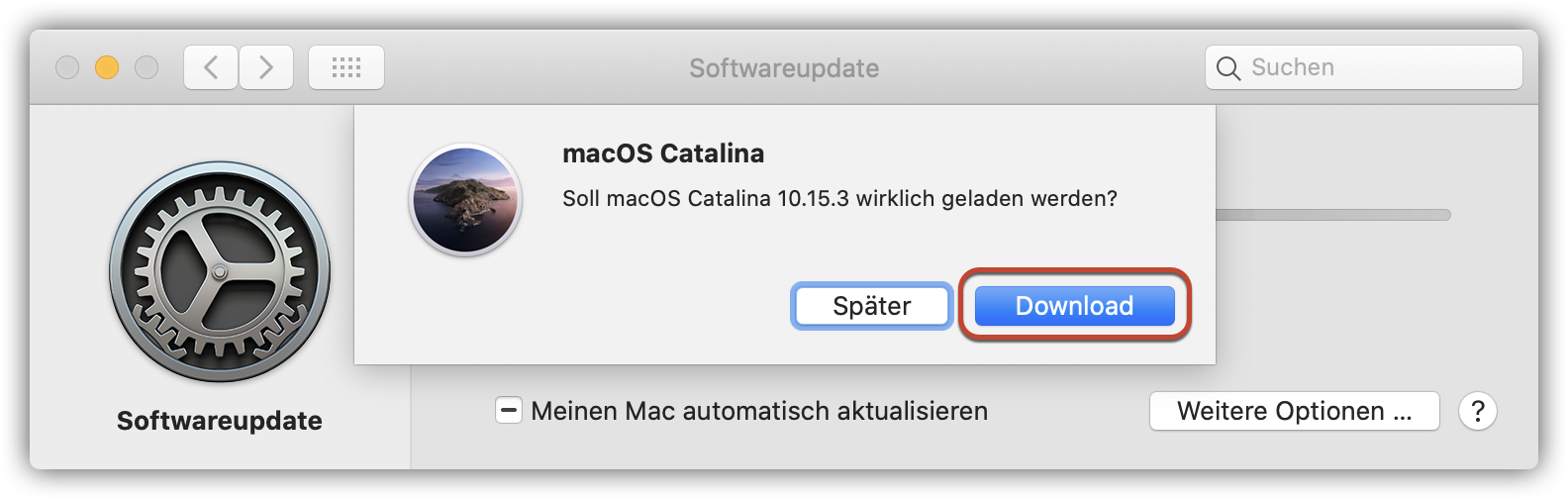 Es öffnet sich das „Softwareupdate“. Bestätige das Laden von macOS mit einem Klick auf „Download“. Nun werden die Installationsquellen geladen – dies kann ein paar Minuten dauern: