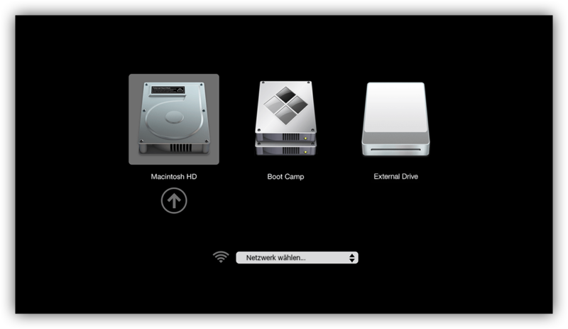 Um den Boot-Stick zu verwenden, musst Du Deinen Mac neustarten und dabei die Wahltaste ⌥ (auch „alt“ genannt) gedrückt halten, bis der „Startup Manager“ oder die Aufforderung zur Eingabe des Firmware-Kennworts erscheint. Wenn Du den Boot-Stick noch nicht an den Mac angeschlossen hast, musst Du ihn jetzt anschließen und im „Startup Manager“ auswählen: