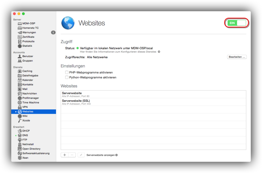 Als nächstes musst Du den Dienst „Websites“ einschalten, damit Dein Profilmanager auch übers WLAN und Internet erreichbar ist: