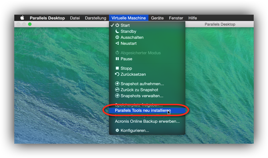 Anschließend startest Du Deine OS X-VM und aktualisierst die Parallels Tools: