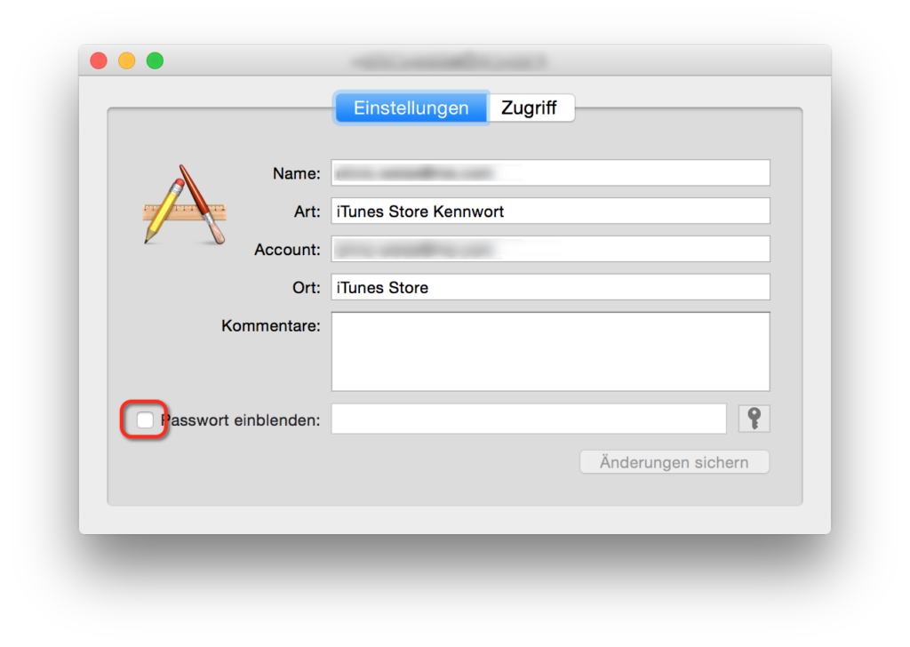 Wichtig ist, dass Du im rechten oberen Bereich „Schlüsselbunde“ den Schlüsselbund „Anmeldung“ auswählst. Anschließend suchst Du bei den Einträgen nach dem Eintrag, der unter „Art“ „iTunes Store Kennwort“ anzeigt. Anschließend klickst Du doppelt auf den Eintrag und siehst die Informationen zu dem Eintrag: