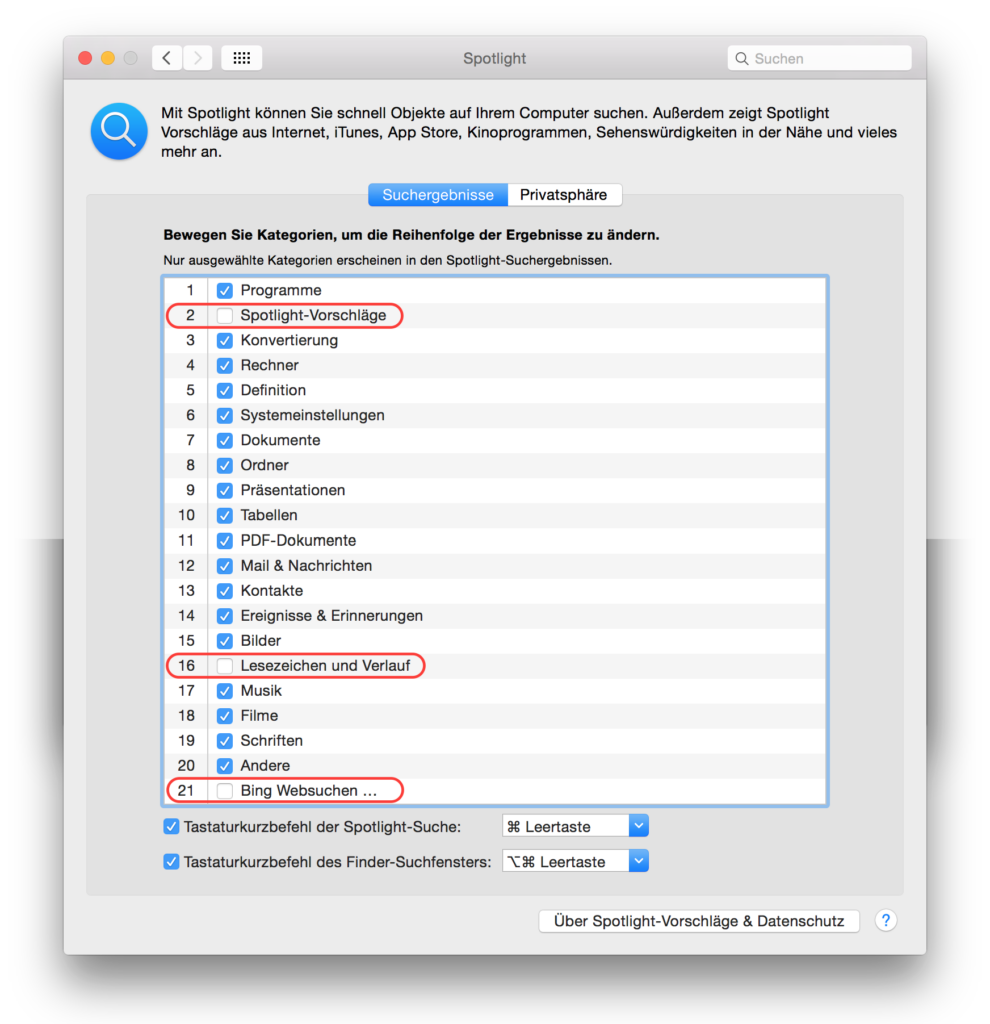 In der Auswahl der Spotlight-Suchergebnisse musst Du die „Spotlight-Vorschläge“, „Lesezeichen und Verlauf“ und die „Bing Websuchen …“ deaktivieren:
