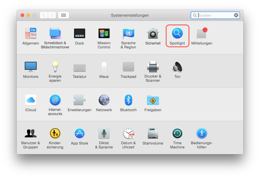 Gehe in die „Systemeinstellungen“ und wähle „Spotlight“ aus: